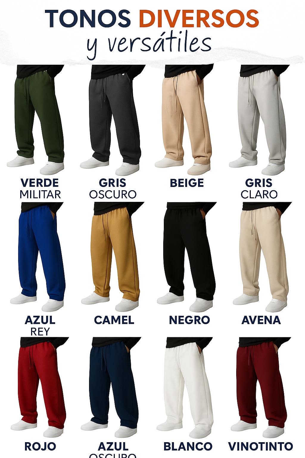 Tenemos una amplia gama de colores disponibles: Avena, Azul Oscuro, Gris Oscuro, Blanco, Negro, Camel, Gris Claro, Azul Rey, Verde Militar. Si el color que buscas no aparece momentáneamente, puede ser temporal o en reposición.