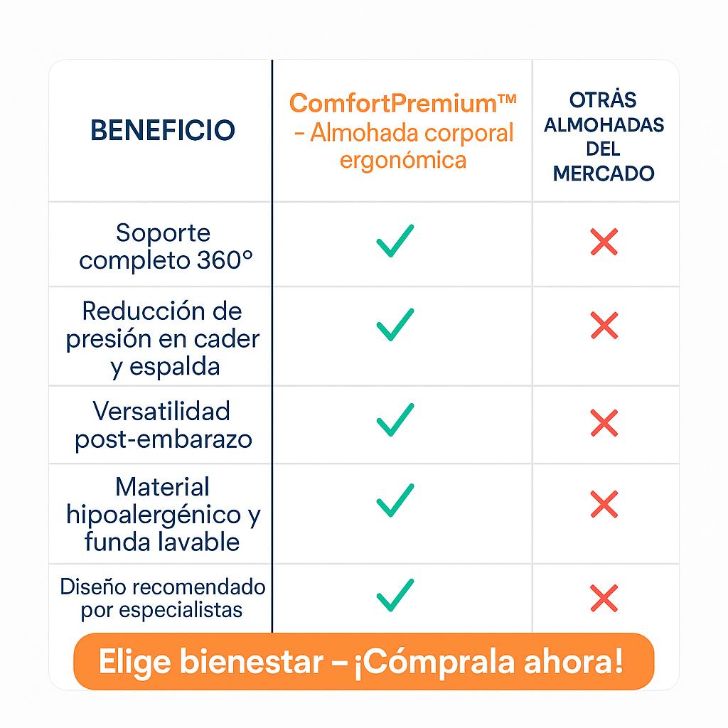 A diferencia de las almohadas comunes, la ComfortPremium™ brinda soporte 360° que envuelve el cuerpo, alivia la presión en espalda y caderas, es hipoalergénica y recomendada por especialistas para mejorar el descanso seguro de mamá y bebé.
