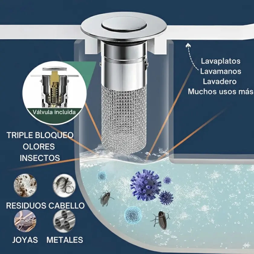Claro que sí. Su malla de acero inoxidable atrapa restos de comida, cabellos y mugre antes de que tapen la tubería.